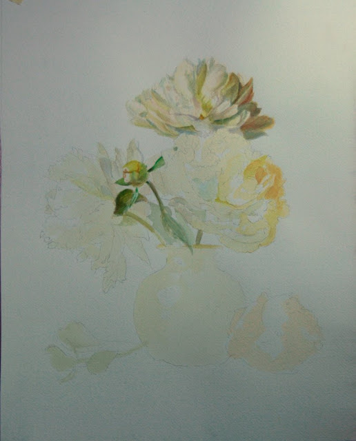 Since my oil painting composition of the peonies isn't working I thought I would try another idea....in watercolor. A simpler arrangement... Here is what my beginning looks like.